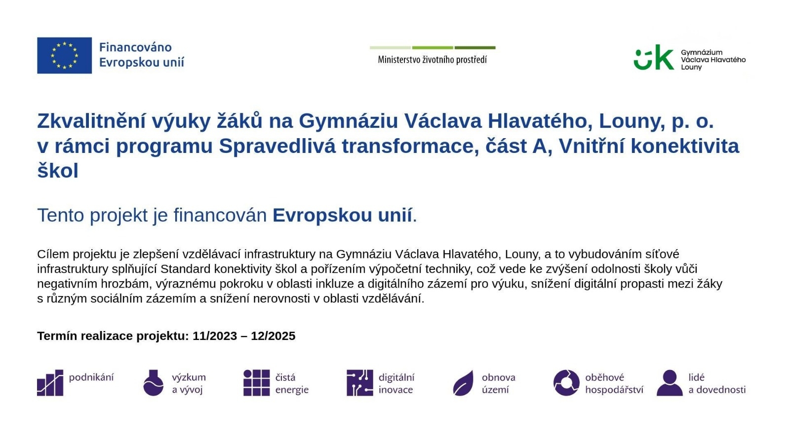 V rámci investice č. 2: Vybavení škol digitálními technologiemi z komponenty 3.1 Inovace ve vzdělávání v kontextu digitalizace z Národního plánu obnovy obdržela škola finanční prostředky k dosažení cíle č. 172 zakoupením části technologií a vybavení za účelem dálkového studia.