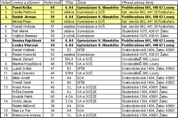 | Pořadí nejlepších kategorie STUDENT - okres Louny - KLOKAN 2013 | ||||
