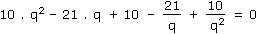 kde buď ai = an-i (i=0, 1, 2, ..., n) - tzv. kladně reciproká rovnice, nebo ai = - an-i (i=0, 1, 2, ..., n) - tzv. záporně reciproká rovnice. z1 = 2,5; z2 = - 0,4 Za z = 2, 5 dosadíme do rovnice (*), dostaneme rovnici 2 q2 - 5 q + 2 = 0, která má kořeny q1 = 2, q2 = 0,5. Pro q = 2 dostáváme a1 = 5, dále potom a2 = 10, a3 = 20, a4 = 40, a5 = 80. Pro q = 0,5 dostáváme a1 = 80, dále potom a2 = 40, a3 = 20, a4 = 10, a5 = 5. Dosadíme-li za z = - 0,4 do rovnice (*), dostaneme rovnici 5 q2 + 2 q + 5 = 0, která nemá reálné kořeny (D= - 96). |